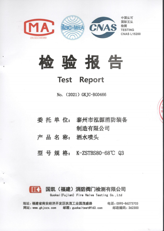 啟真灑水噴頭ZSTDY80-68°C Q3檢驗報告